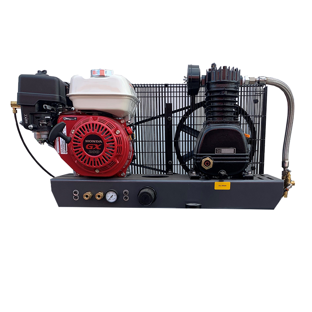 The Knight GX200 Honda engine driven 10 gallon air compressor, comes standard with our industrial duty 200PSI rated air tank, oversized Ag tire to make the packages easier to roll around the job site or house 14CFM@40PSI, pull start, 10 gallon tank, heavy duty industrial grade cast iron air compressor pump.