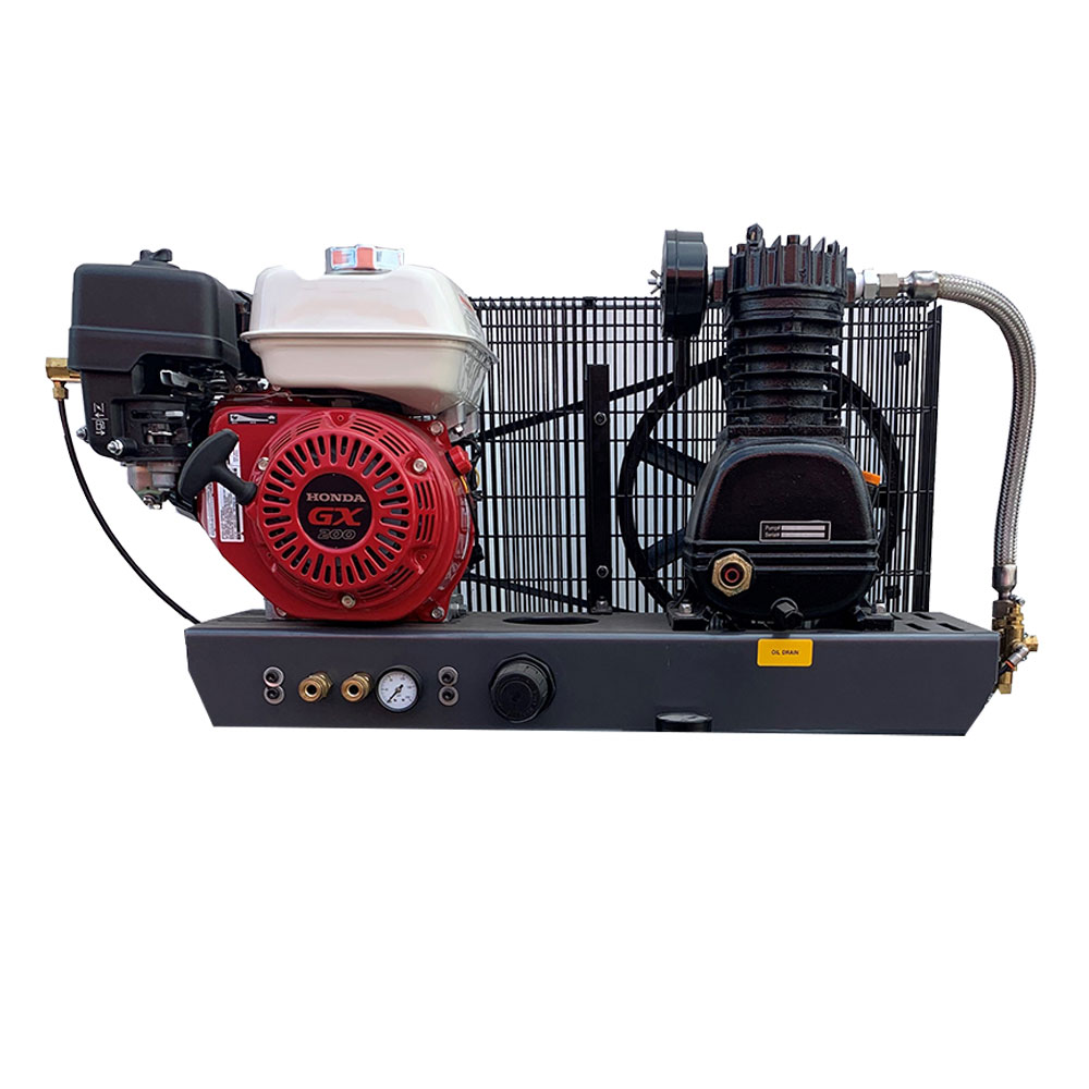 The Knight GX200 Honda engine driven 20 gallon air compressor, comes standard with our industrial duty 200PSI rated air tank, oversized Ag tire to make the packages easier to roll around the job site or house 14CFM@40PSI, Pull start, 20 gallon tank, heavy duty industrial grade cast iron air compressor pump.