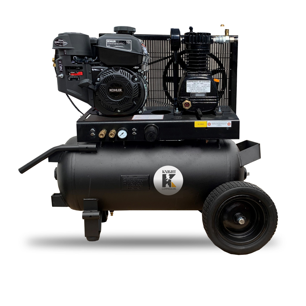 The Knight CH255 Kohler engine driven 20 gallon air compressor, comes standard with our industrial duty 200PSI rated air tank, oversized Ag tire to make the packages easier to roll around the job site or house 14CFM@40PSI, Pull start, 20 gallon tank, heavy duty industrial grade cast iron air compressor pump.