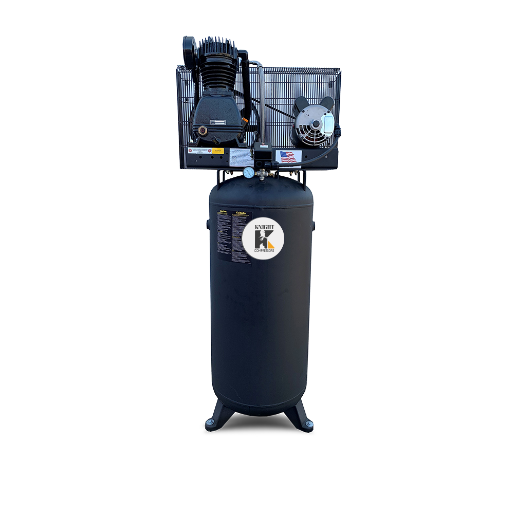 The Knight 5hp 60 gallon air compressor, comes standard with our industrial duty 200PSI rated air tank, two stage industrial cast iron air compressor pump, 22CFM@40PSI, 208-230V 1 phase, 60 gallon tank.