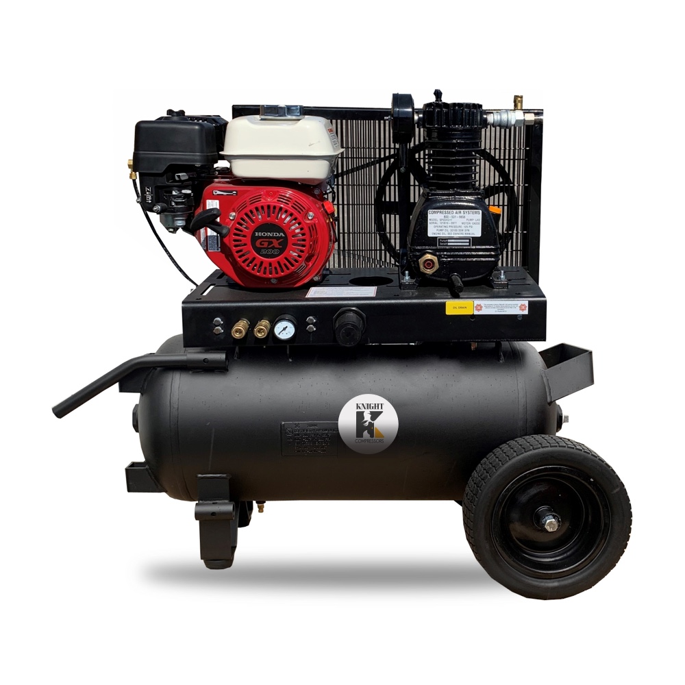 The Knight GX200 Honda engine driven 20 gallon air compressor, comes standard with our industrial duty 200PSI rated air tank, oversized Ag tire to make the packages easier to roll around the job site or house 14CFM@40PSI, Pull start, 20 gallon tank, heavy duty industrial grade cast iron air compressor pump.