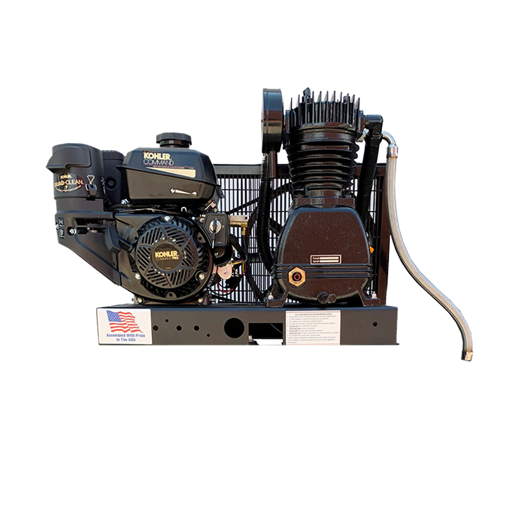 The Knight CH255 Kohler engine driven 20 gallon air compressor, comes standard with our industrial duty 200PSI rated air tank, oversized Ag tire to make the packages easier to roll around the job site or house 14CFM@40PSI, Pull start, 20 gallon tank, heavy duty industrial grade cast iron air compressor pump.